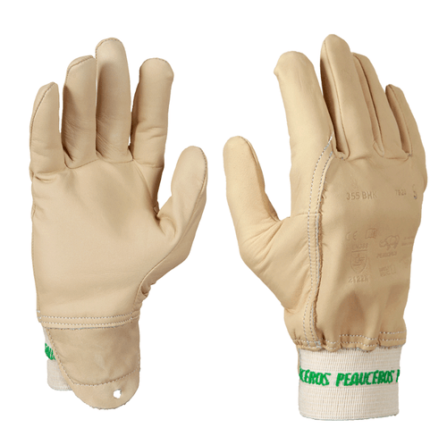 Gants de protection anti-coupure légers en cuir bovin beige avec doublure para-aramide. Offrent confort, souplesse et sécurité lors de la manipulation d’objets coupants. Parfaits pour les travaux légers et réseaux TP. Fabrication française, qualité Peauceros.